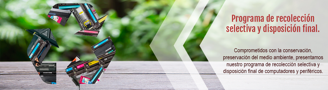 Ponemos a su disposición nuestro programa de recolección y manejo de residuos de computadores, y/o periféricos, y cartuchos vacíos de tóner, servicio el cual es sin ningún tipo de costo para el cliente. Donde nos encargamos de la recolección de los residuos, los cuales van debidamente empacados, para evitar fugas que contaminen el ambiente y direccionados al centro de acopio que correspondiente.